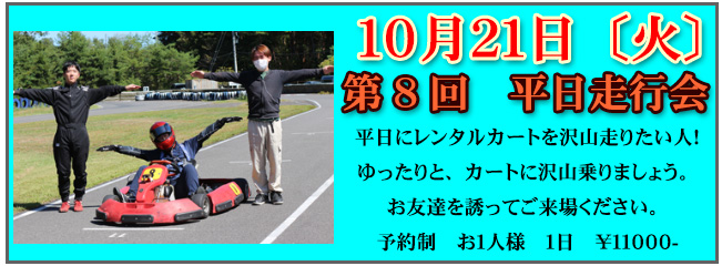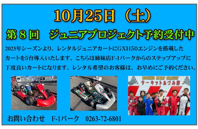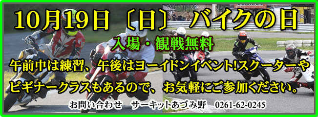 【 サーキットあづみ野から貸し切りのお知らせです 】 記 ① 10月18日 土曜日 9:00 ~ 13:00 ② 10月29日 水曜日 終日 上記の時間は一般の方の走行が出来ません。 時間帯または日時をずらしてお越しくださいませ。 よろしくお願いいたします。 |