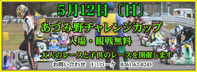 | 5月12日〔日〕 あづみ野チャレンジカップ 第2戦 サーキットあづみ野の持ち込みメインレース”あづちゃれ” 開幕します。 観戦無料です。激しい大人のレースと、小学生の感動のレースを是非ご覧ください。 |