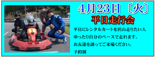| 4月23日(火) 平日走行会 ゆったり、たくさん、レンタルカートで遊びたい方は最適です。 |