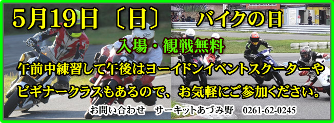 | 5月19日(日) バイクの日 スクーター・エンジョイ初心者クラス・ミニバイククラス開催 気軽に出られるイベントです。 バイクの皆さん春ですよ~。 |